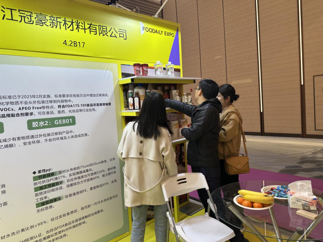 隨著食品安全監(jiān)管不斷加強(qiáng),浙江冠豪高度重視食品接觸材料的安全合規(guī)。本次展出的包裝用膠黏劑產(chǎn)品全面符合2025年2月起實(shí)施的GB 4806.15-2024《食品安全國(guó)家標(biāo)準(zhǔn) 食品接觸材料及制品用黏合劑》及美國(guó)FDA 175.105要求,產(chǎn)品具備高粘性、低VOCs、APEO-Free等性能優(yōu)勢(shì),保障安全同時(shí)實(shí)現(xiàn)綠色性能升級(jí)。展會(huì)現(xiàn)場(chǎng)人流絡(luò)繹不絕,眾多食品企業(yè)代表駐足交流,對(duì)產(chǎn)品安全性能給予充分認(rèn)可。